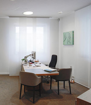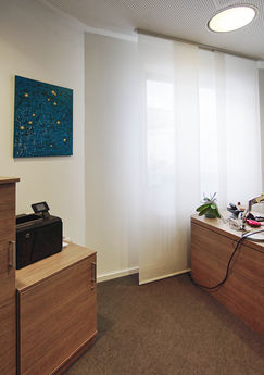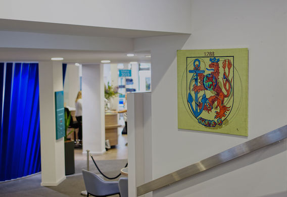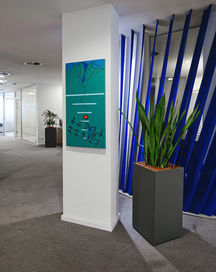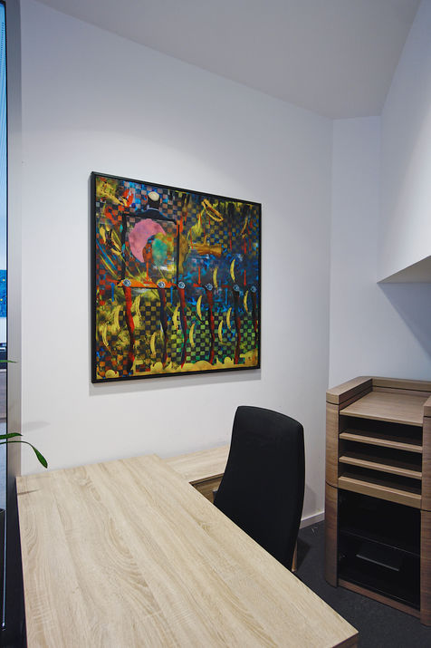 Ich sage nein – werfen wir einen Blick auf das hellste, freundlichste und „eindeutigste“ Bild der Ausstellung. Das Bild „die Stadtmonaden“ - ein Bild in Zitrusgelb zeigt das Stadtwappen der Stadt Düsseldorf in prachtvollen Farben. Es gibt einen äußerlichen Blick auf Düsseldorf, der Nachbarstadt Hilden. Die Assoziation an die Hauptstadt Nordrhein-Westfalens wird durch diverse Detailansichten bekannter Manier hervorgerufen. Eine Monade ist nach Giordano Bruno sowohl physisches als auch psychisches Wirklichkeitselement. Es ist das Einfache, unteilbare – es ist nach Leibnitz die letzte Ureinheit, die in sich geschlossen ist und sich nicht weiter auflösen lässt. Dabei sind wir Teil des Großen. Egal, ob bezogen auf eine Stadt, ein Land, einen Kontinent, einen Planeten, ein Universum. Wir sind die Ureinheit des Großen und Ganzen – des Göttlichen und der Liebe. Mit dem Wissen können wir sein. Also sind wir!